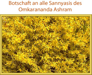Mit Sannyasa wurdet ihr erhoben in die allwunderbare Welt der ewigen Wahrheit; ihr habt eine neue Schau erworben, eine neues Herz, einen neuen Verhaltenskodex bekommen. In allen Tempeln des Omkarananda Ashram gibt es nur einen Gott, eine Wahrheit, eine Göttliche Mutter, einen Guru und ein Licht, das die Seele eurer Seele ist, das Leben eures Lebens. Jede Stunde, jeden Tag denkt als das Göttliche, fühlt wie das Göttliche, arbeitet wie das Göttliche! Lasst jede Stunde eures Lebens ein Licht hervorbringen, Freude, Sonnenschein und einen Himmel für alle erschaffen!